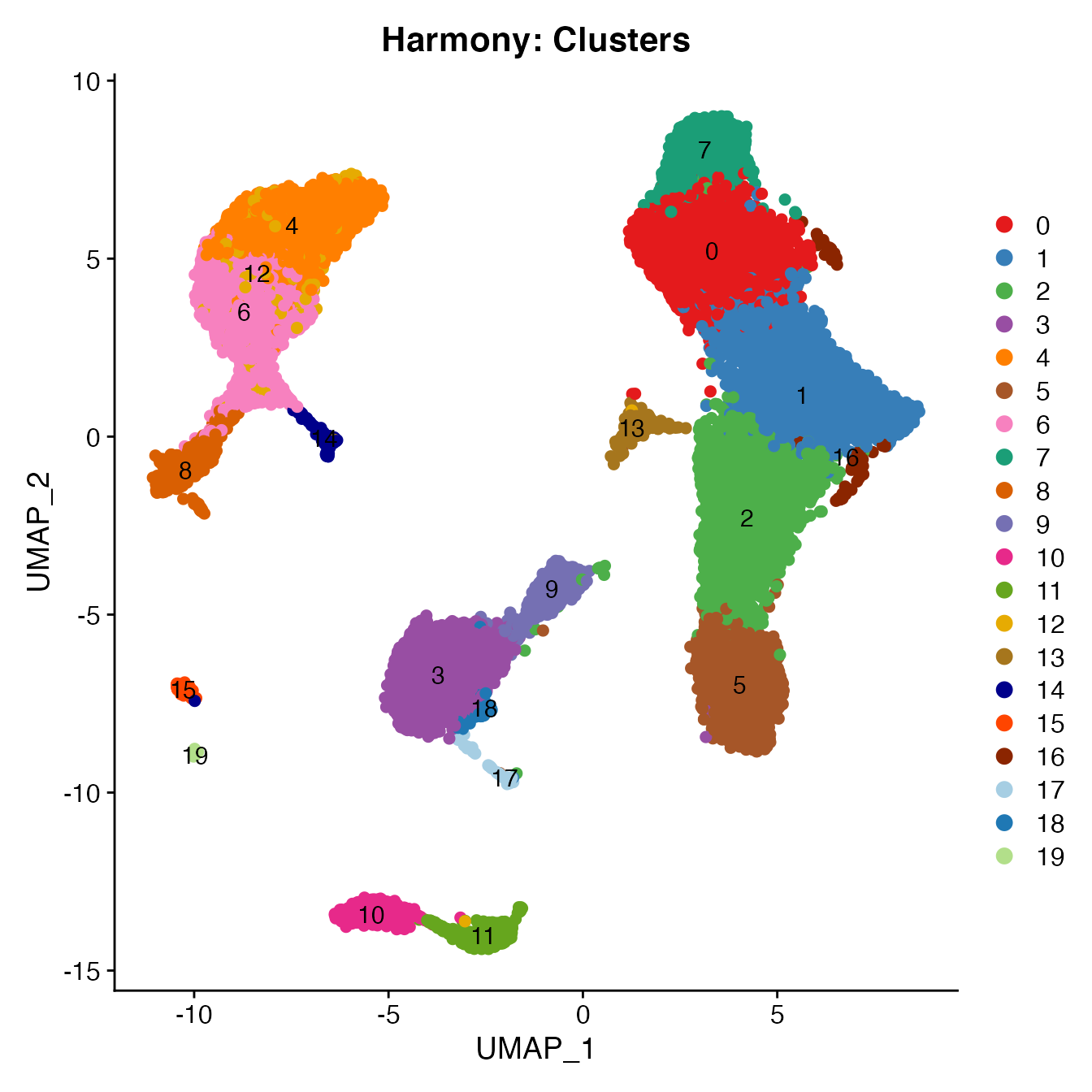 RunUMAP(reduction = "harmony", dims = 1:14) %>%