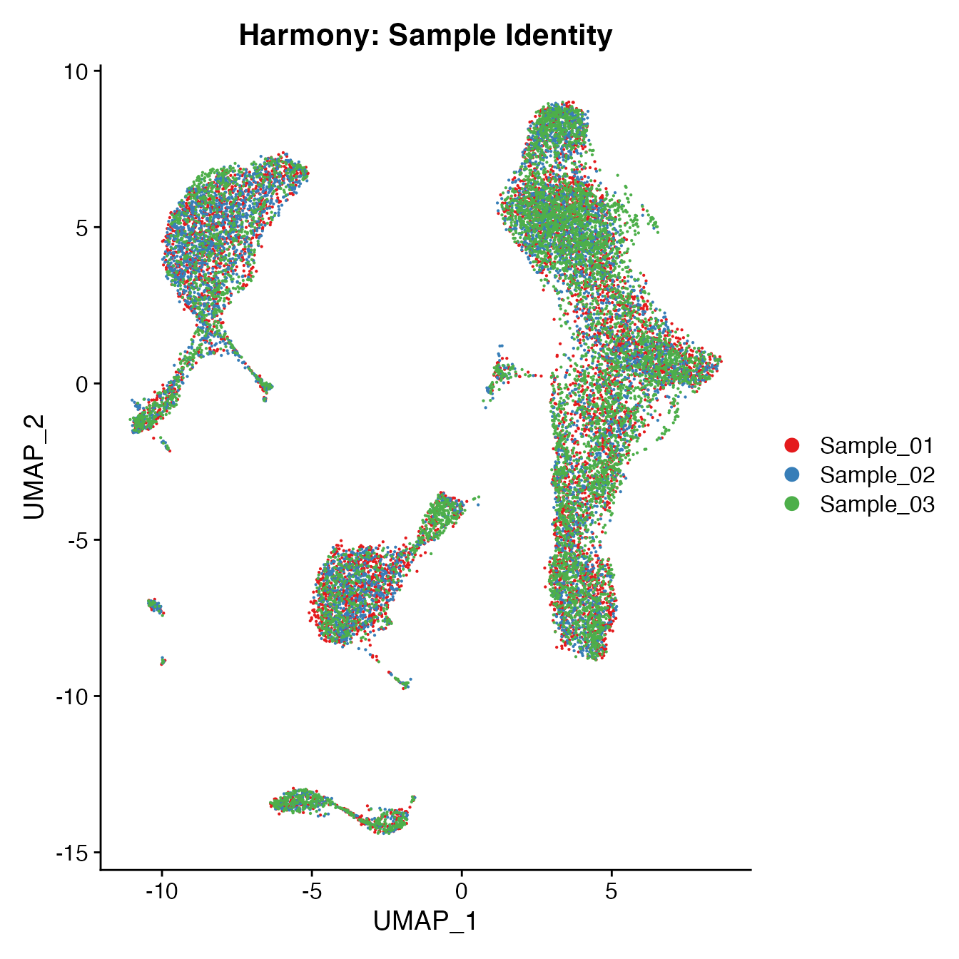 UMAPPlot(PBMCs, cols = colors.use, group.by = "orig.ident") + ggtitle("Harmony: Sample Identity")