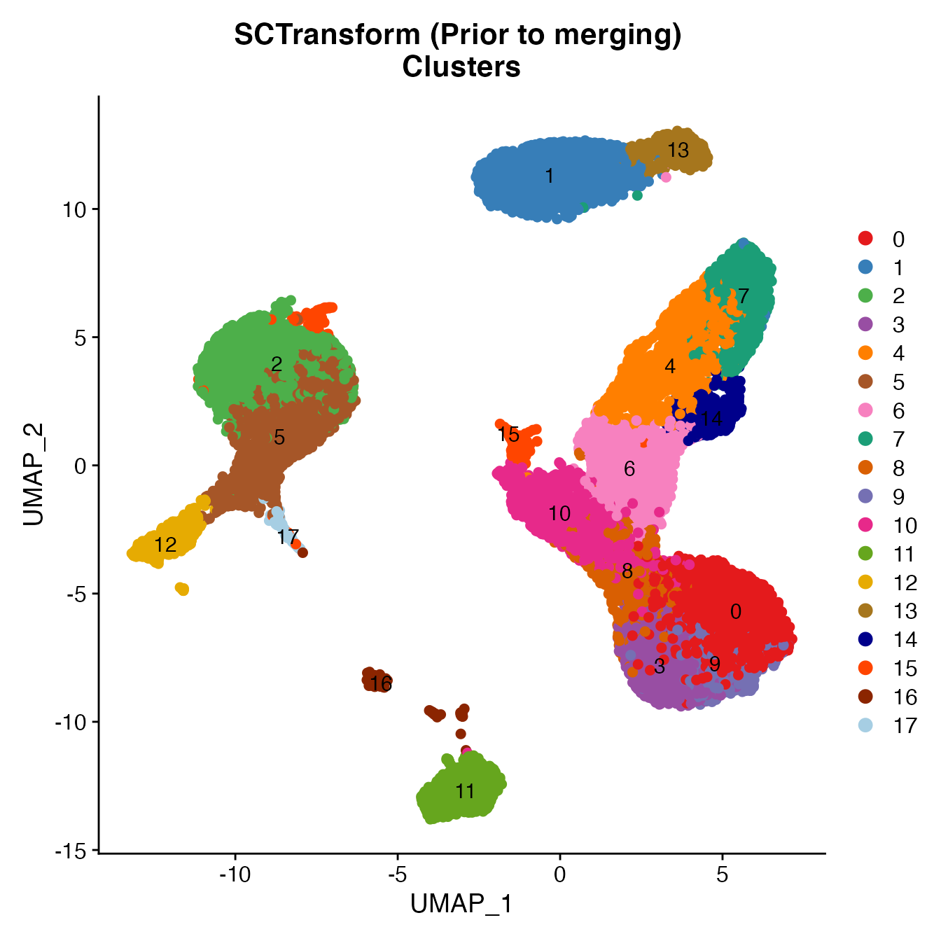 group.by = "seurat_clusters", label = T) + ggtitle("SCTransform (Prior to merging) \nClusters")