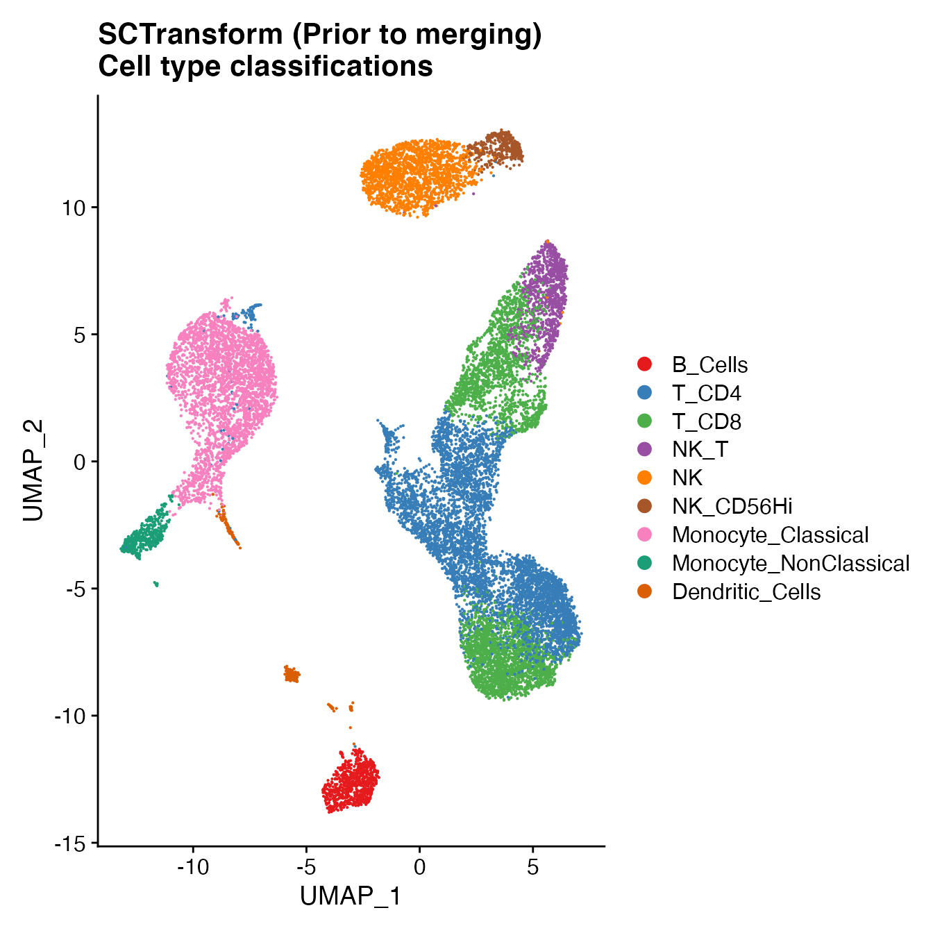 UMAPPlot(PBMCs, cols = colors.use, label = F) + ggtitle("SCTransform (Prior to merging) \nCell type classifications")