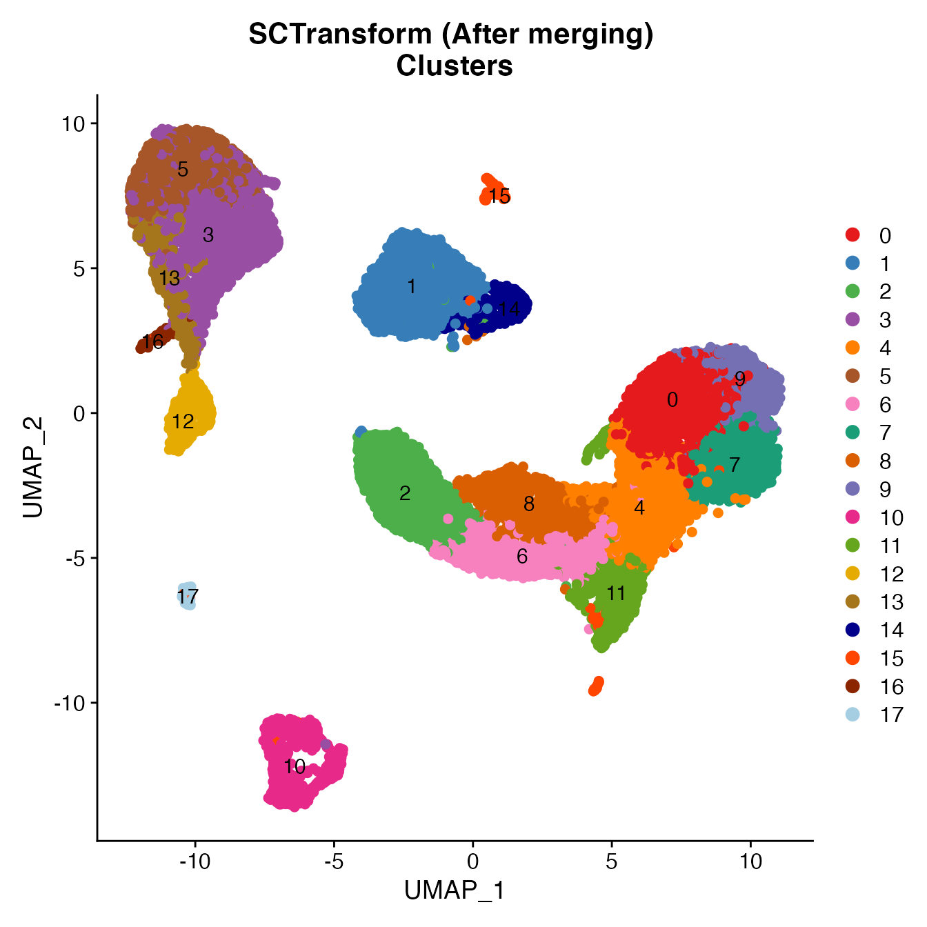 group.by = "seurat_clusters", label = T) + ggtitle("SCTransform (After merging) \nClusters")