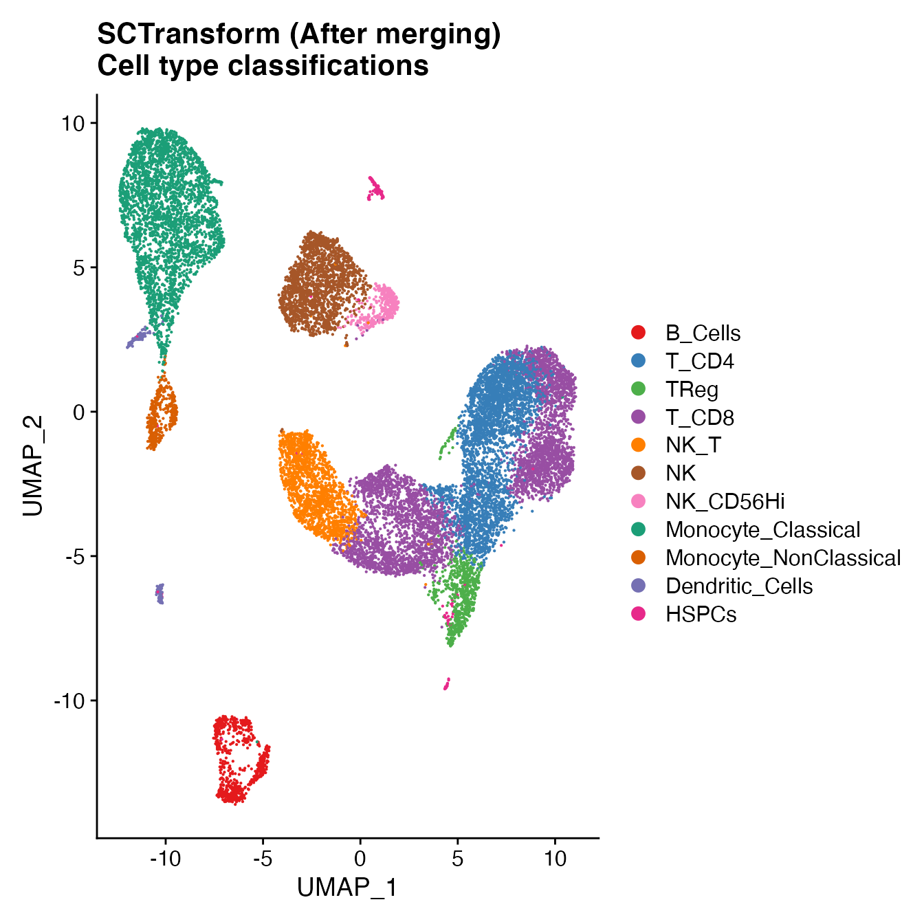UMAPPlot(PBMCs, cols = colors.use, label = F) + ggtitle("SCTransform (After merging) \nCell type classifications")