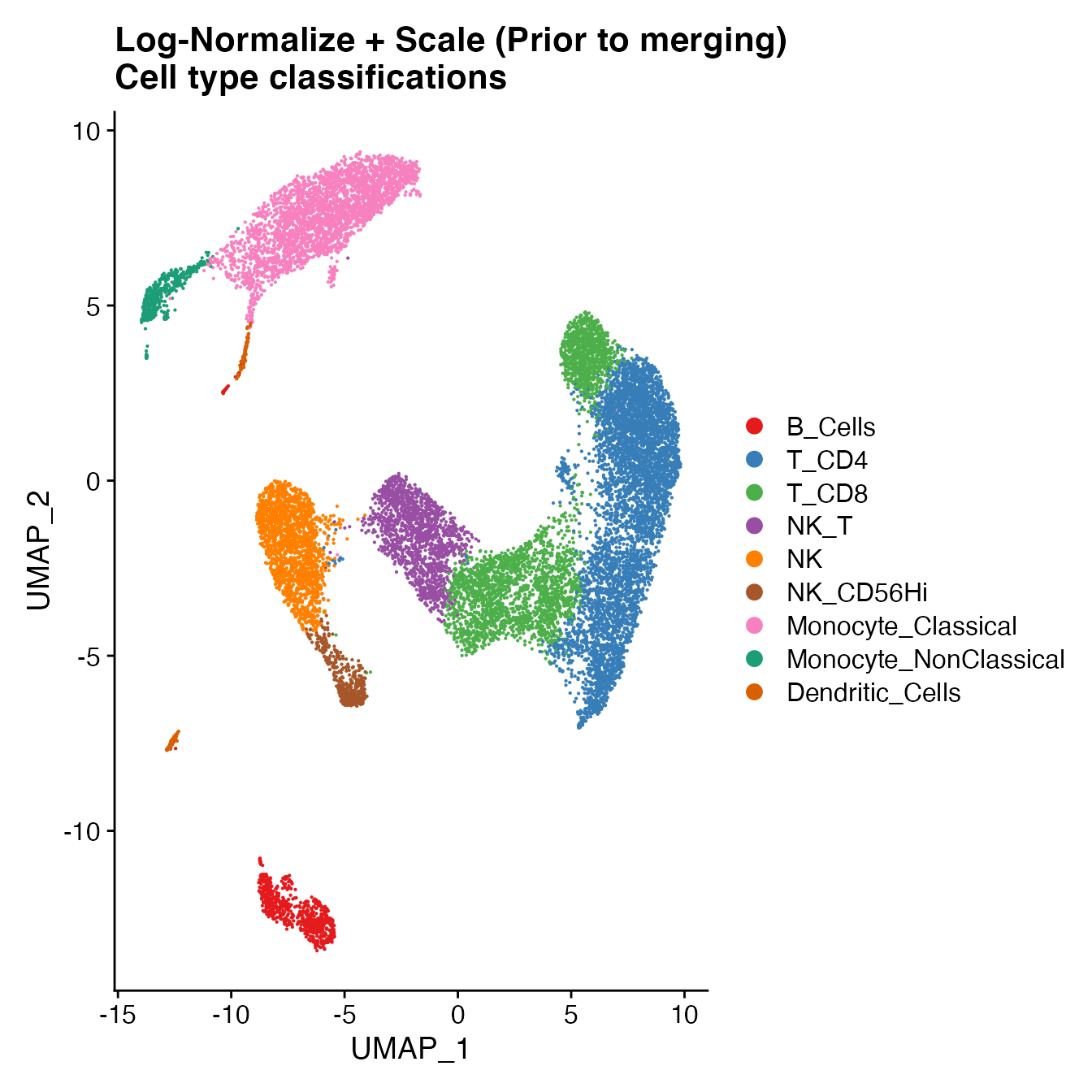 UMAPPlot(PBMCs, cols = colors.use, label = F) + ggtitle("Log-Normalize + Scale (Prior to merging) \nCell type classifications")