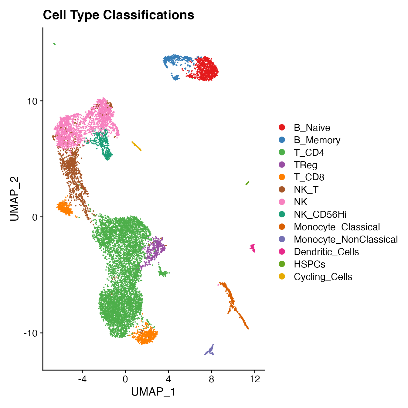 UMAPPlot(PBMC5, cols = colors.use, label = F) + ggtitle("Cell Type Classifications")