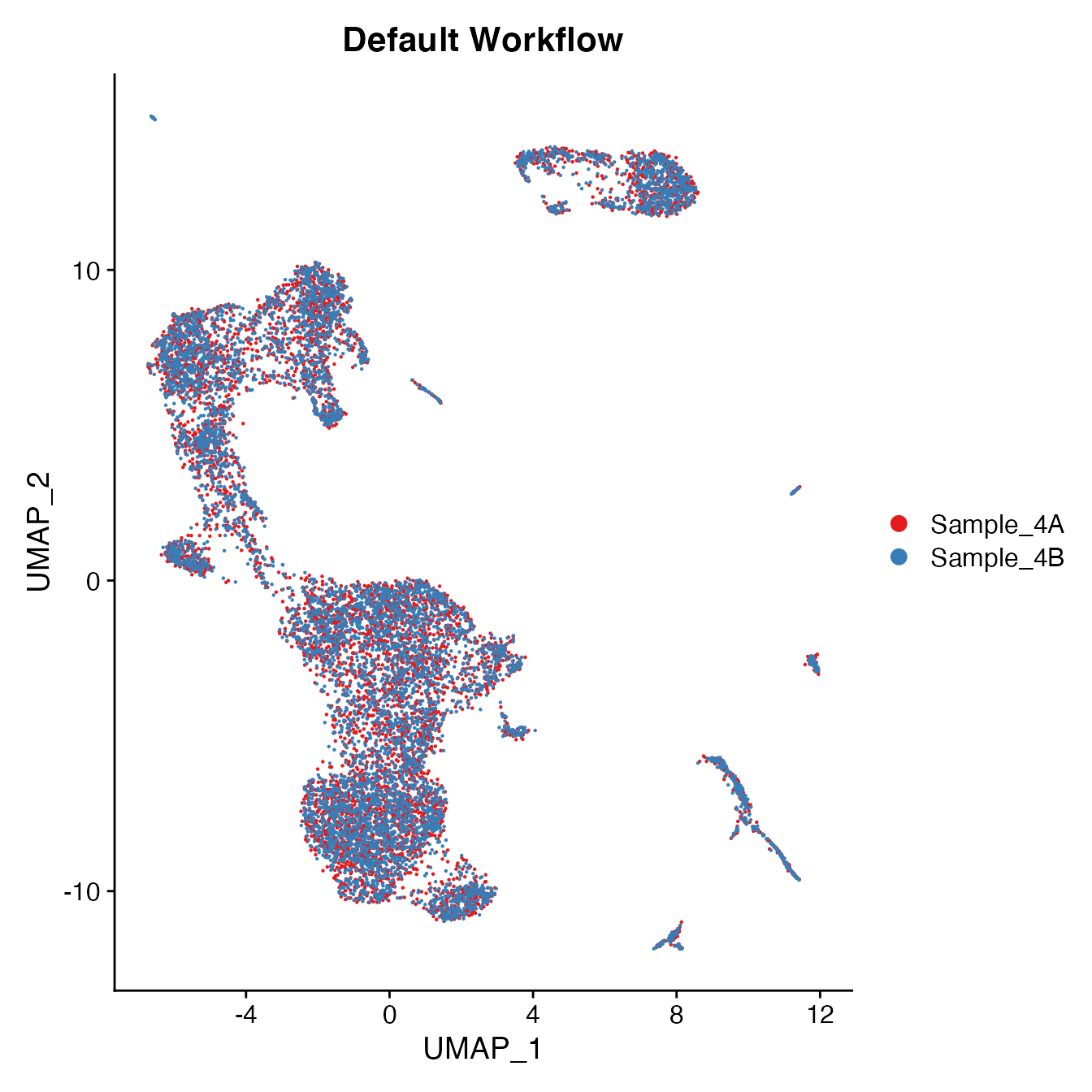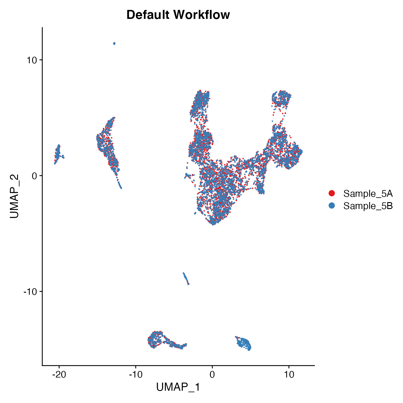 UMAPPlot(PBMC5, cols = colors.use, group.by = "orig.ident") + ggtitle("Default Workflow")